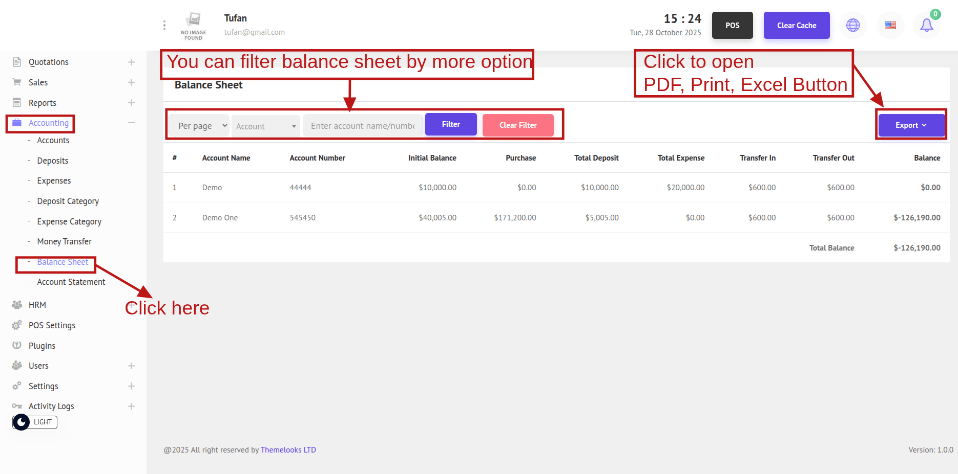 To view the Balance Sheet, go to Accounting -> Balance Sheet. You’ll be redirected to the Balance Sheet page, where the data is displayed.