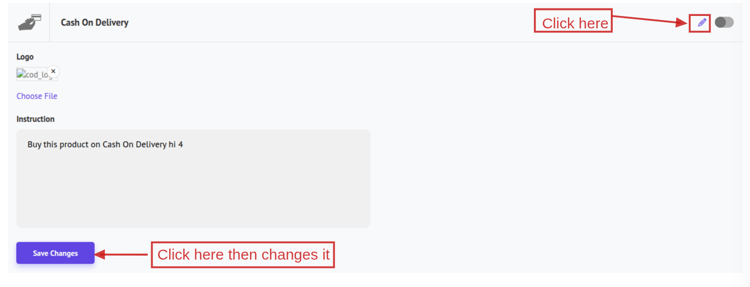 To configure a method, click the Edit icon—the table row will expand under the selected cell to show the input fields; fill them in and click Save Changes.