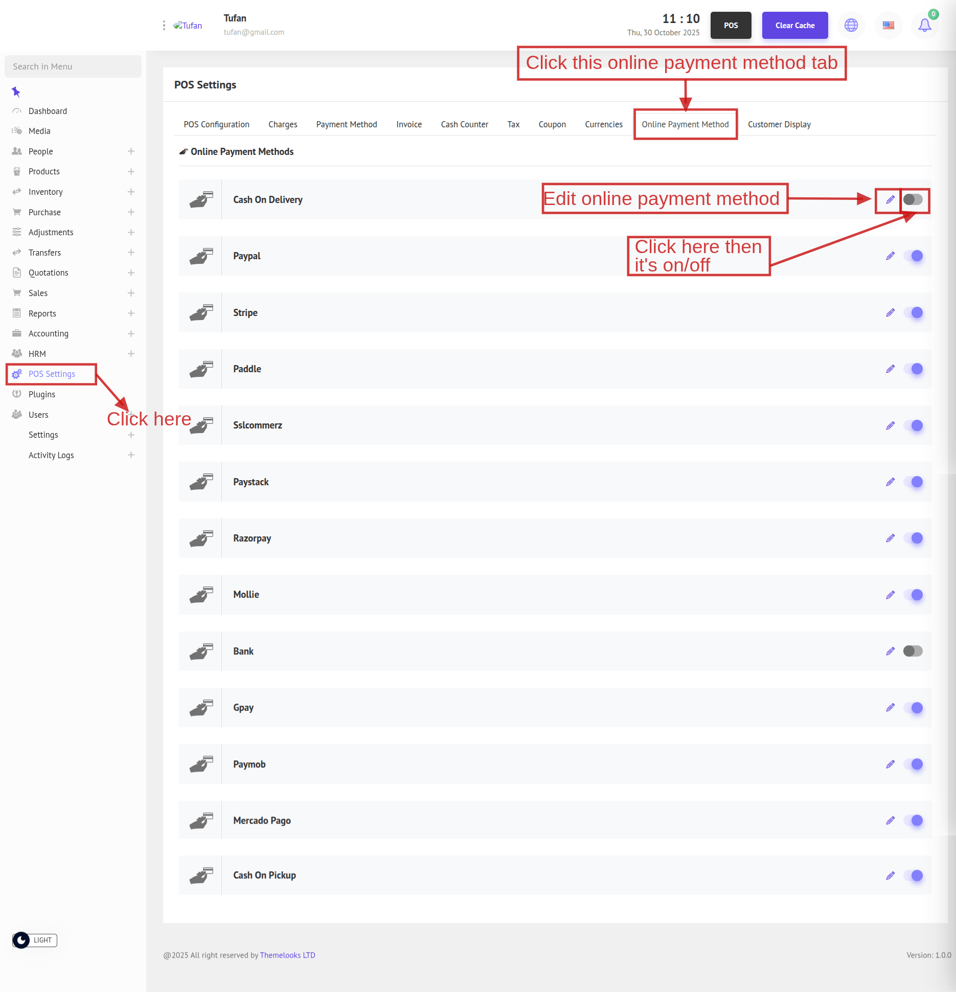Go to POS Settings, then open the Online Payment Method tab to view the Online Payment Method page.