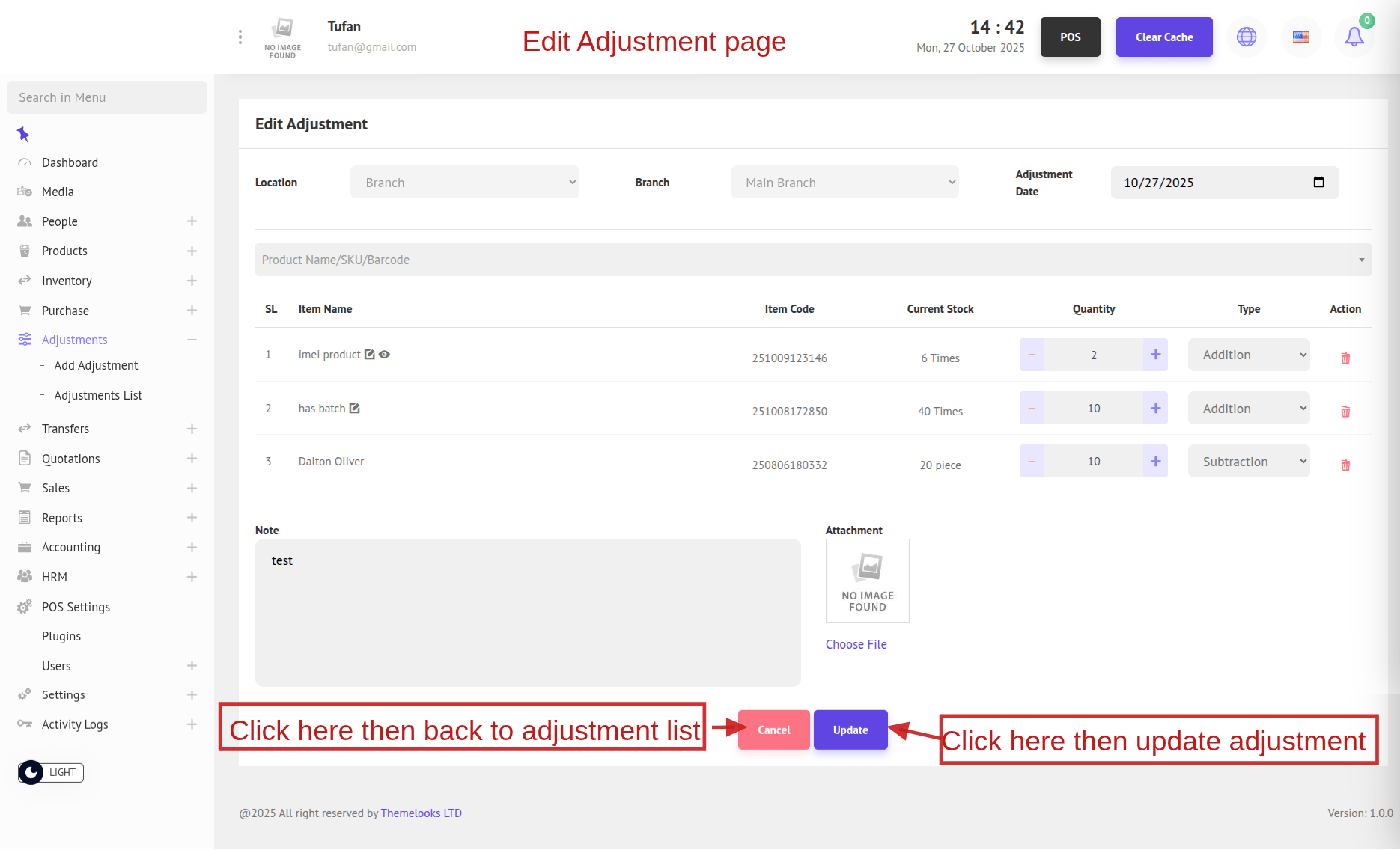 If the product has an IMEI or Serial Number and the adjustment type is Addition, a popup modal will appear. Add the IMEI number and click Add. You can also edit the IMEI by clicking the Edit icon, or view it by clicking the View icon to open a popup modal showing the IMEI or Serial Number details.
