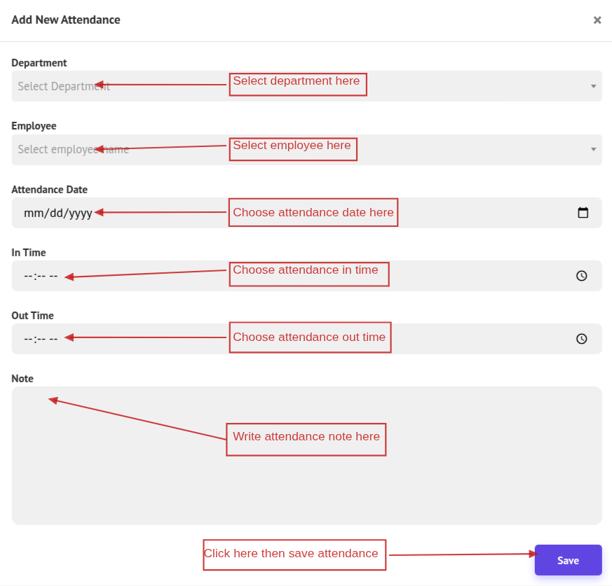 Note: If Department or Employee is not available, create those first. Once added, you can create the attendance record.