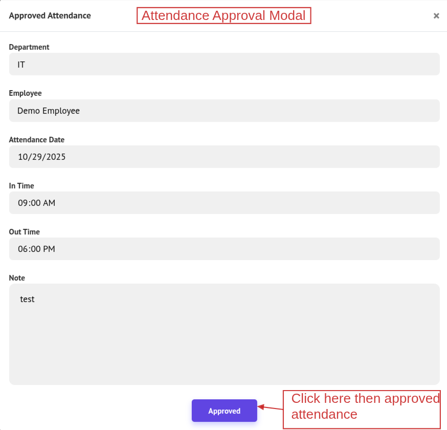 The Approve button is visible only when the leave status is Pending. Click Approve to open a popup showing the attendance details. To proceed, click Approve in the popup; otherwise, close the modal.