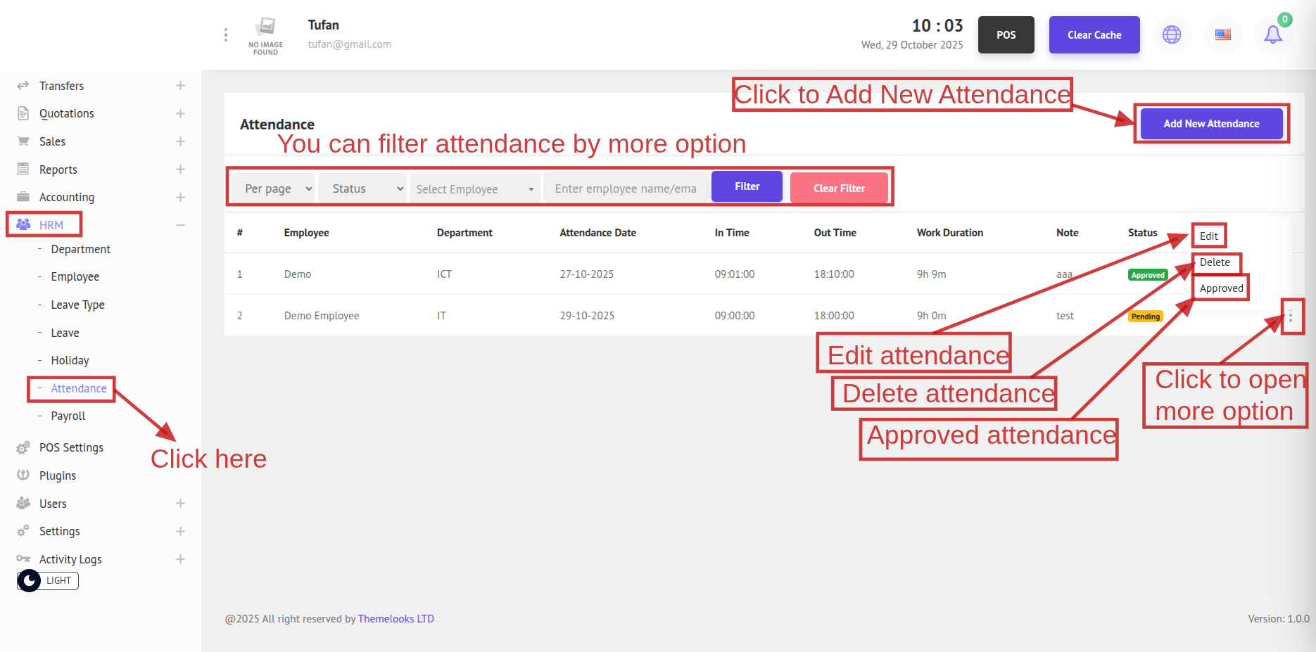 From the menu bar, select HRM -> Attendance. This opens the Attendance page showing all attendance records.