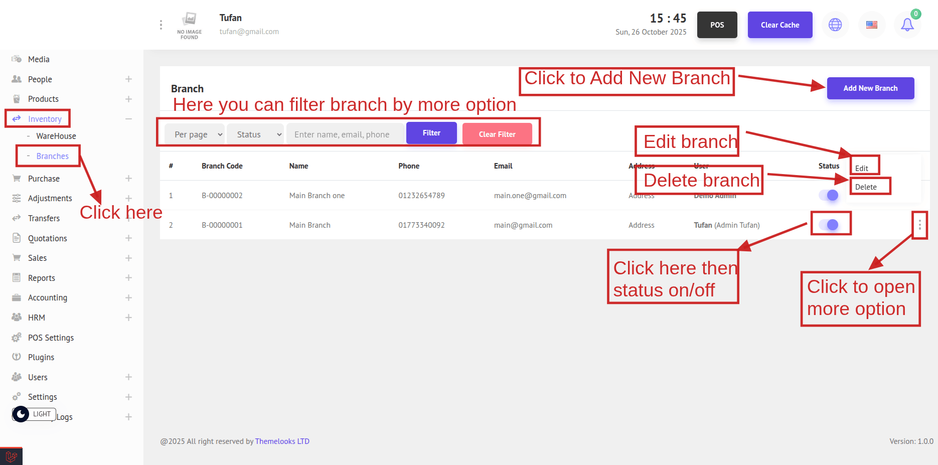 To see the Branch List, go to Inventory -> Branches from the menu bar. You will be able to view all branches on the Branch List page.