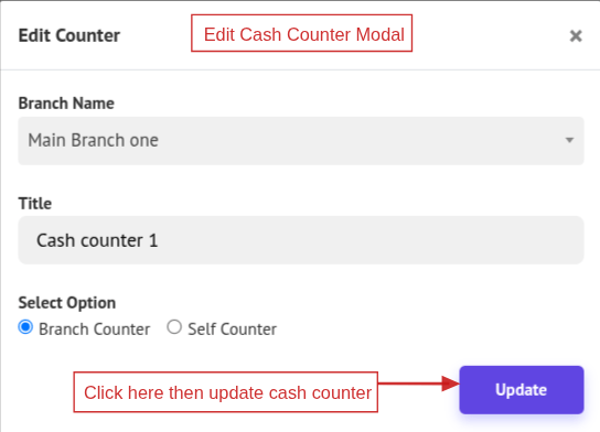 To update a cash counter, click Edit, make the necessary changes in the popup, and click Update to save.