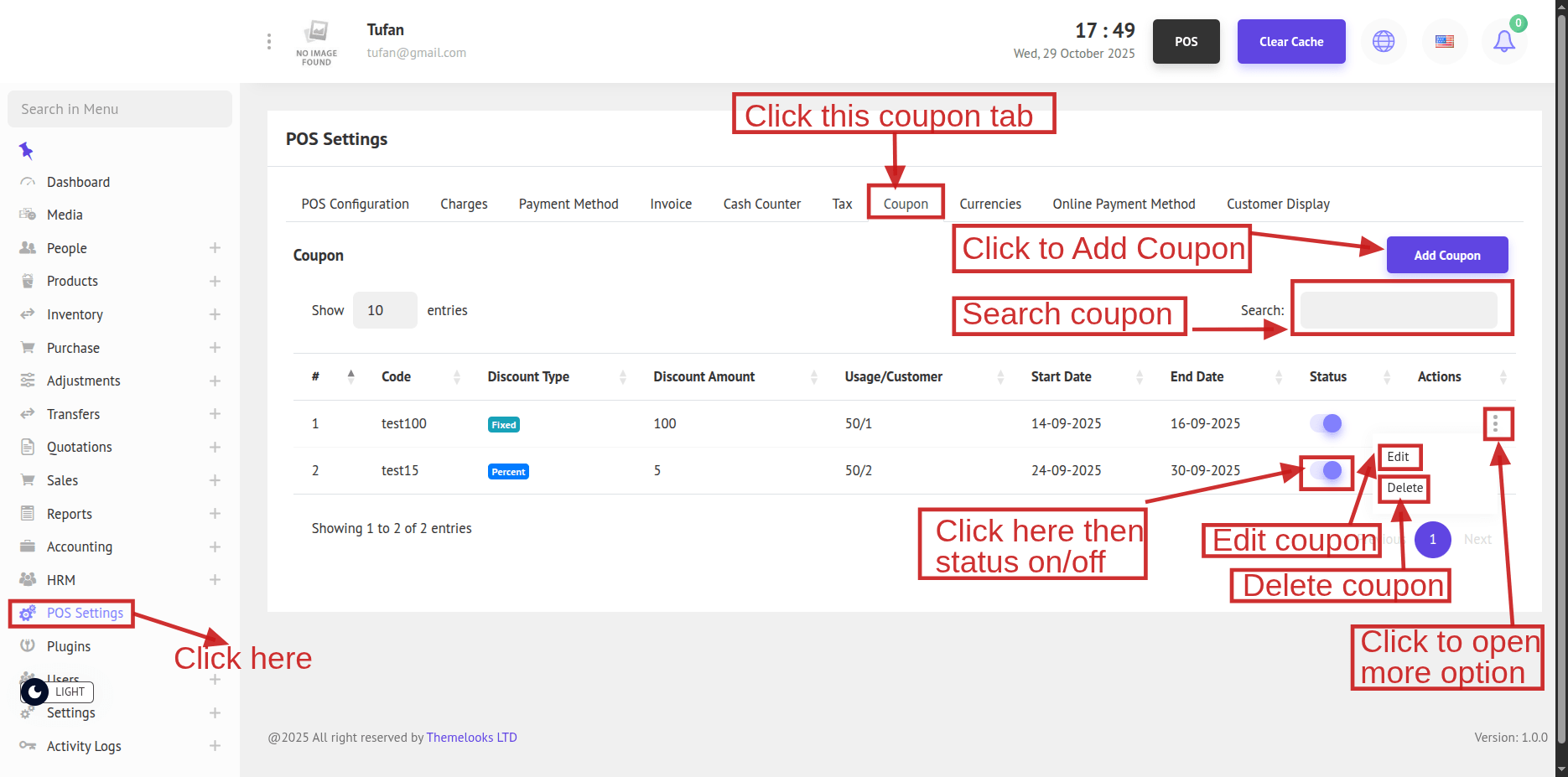 Navigate to POS Settings, When the POS Settings page loads, click the Coupon tab from the tab bar. The system will open the Coupon page, showing all coupon entries.
