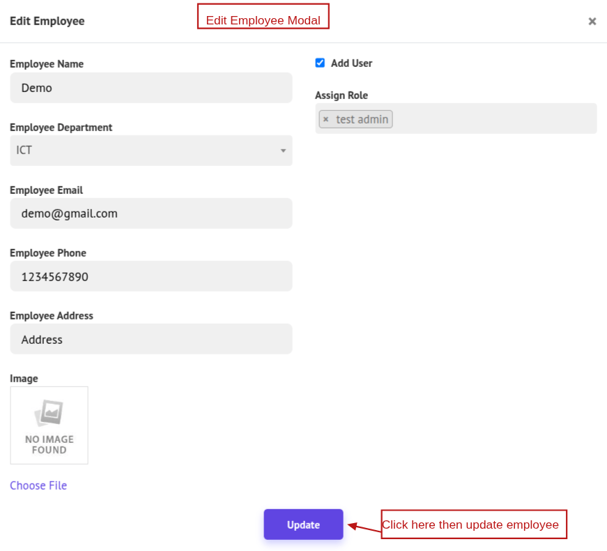To update a employee, click Edit, make the necessary changes in the popup, and click Update to save.