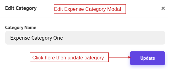 To update a expense category, click Edit, make the necessary changes in the popup, and click Update to save.