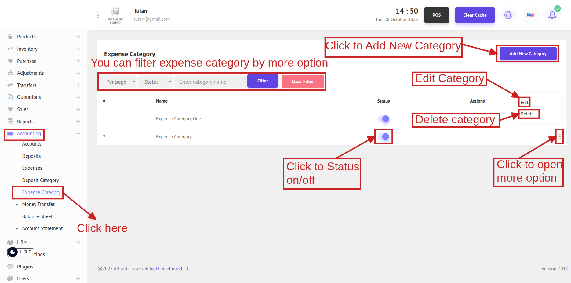 To see the Expense Category list, go to Accounting -> Expense Category from the menu bar. You’ll be redirected to the Expense Category page, where all categories are displayed.