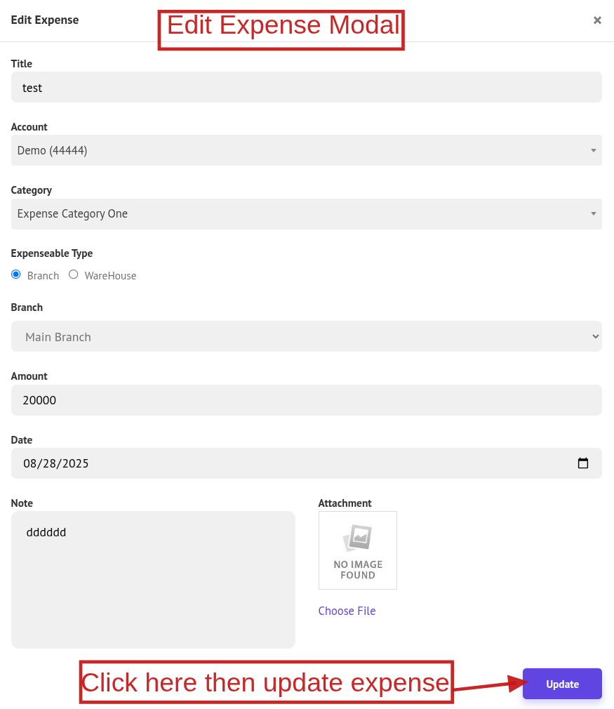 To edit a expense, click Edit to open the edit popup, make your changes, and click Update to updated it. Also you can remove a expense, click Delete.