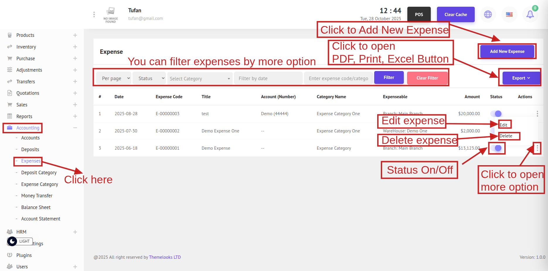 To see the Expenses, go to Accounting -> Expenses from the menu bar. You will be redirected to the Expenses page, where all expense records are displayed. Click Export to download the data in PDF, Excel, or Print format.