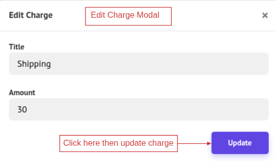 To update a charge, click Edit, make the necessary changes in the popup, and click Update to save.