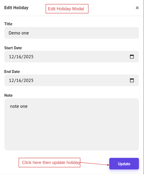 Click Edit to modify a holiday, update the fields in the popup, and click Update to save.