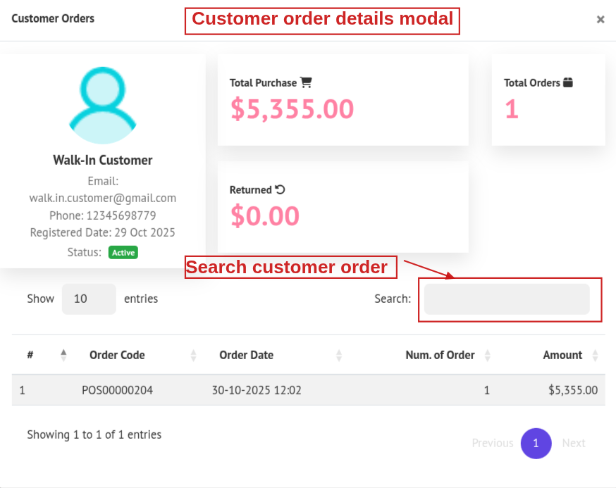 9. Customer Order: After selecting a customer, click the view icon beside their name to open a pop-up showing all orders made by that customer.