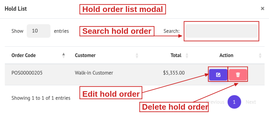 11. Hold Order: Click the Hold Order icon in the header to open a popup showing the current list of hold orders.