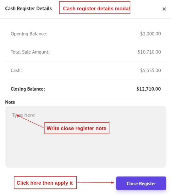 - After reviewing the cash register details, you can enter a note (optional), then click Close Register. The closing balance will be recorded and stored for the day.