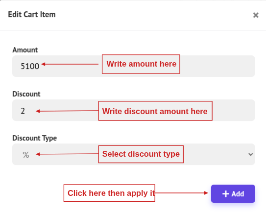 - Set the Changed Amount, Discount Amount, and Discount Type, then click Add. The updated information will be applied to the selected cart item