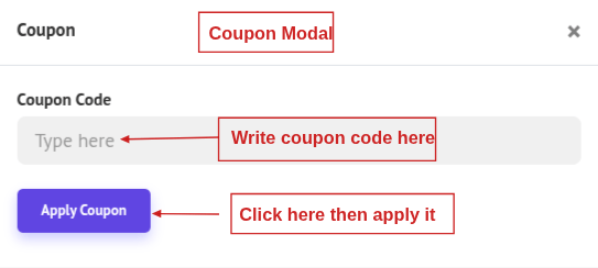 - In the popup, type the Coupon Code, Click Apply Coupon. If the coupon is valid and eligible, the discount is applied; otherwise, you’ll see that it "Coupon not found or expired".