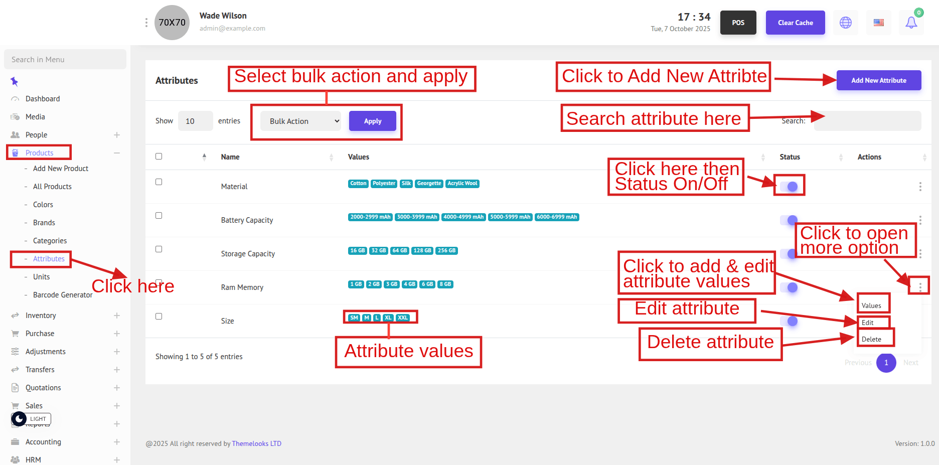 To view the Product Attributes list, go to Products > Attributes. This will display all available product attributes in the system.