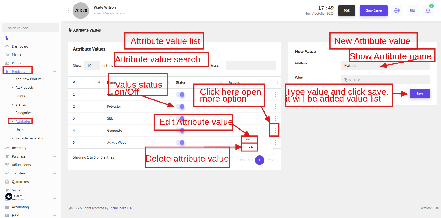 To add attribute values, click Values from the Attribute List. You will be redirected to the Value List of that attribute.