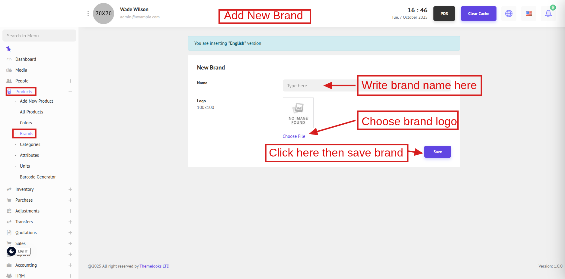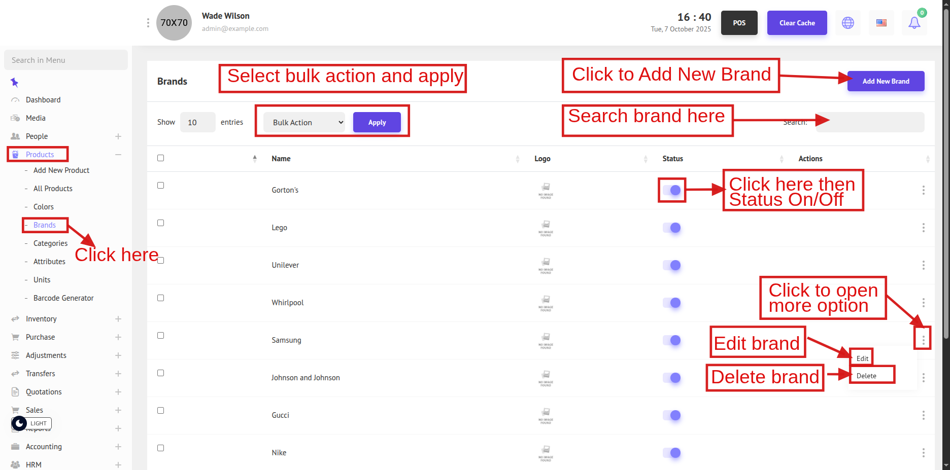 You can view the list of brands and various options on this page. To add a new brand, click the Add New Brand button at the top. You will be redirected to a new page to enter brand details.