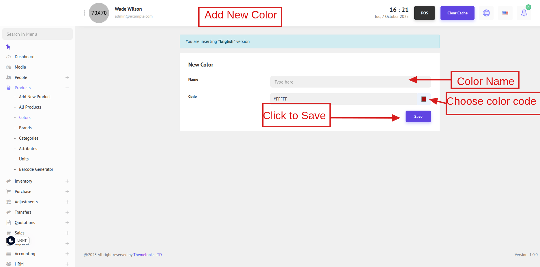 If you want to add a new product color, click Add New Color from the top menu. This will redirect you to the page where you can create a new color entry.