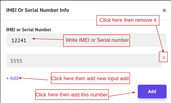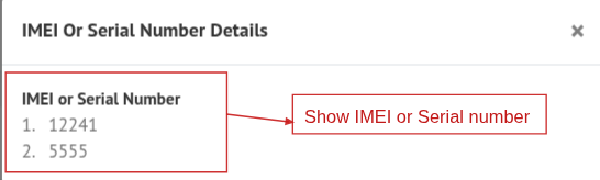 If the product has an IMEI or Serial Number, a popup modal will appear. Add the IMEI number and click Add. You can also edit the IMEI by clicking the Edit icon, or view it by clicking the View icon to open the popup modal showing the IMEI or Serial Number details.