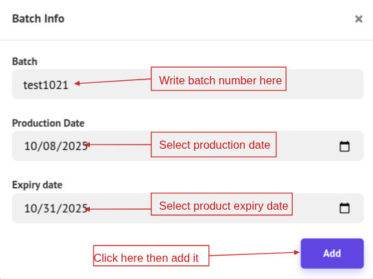 If the product has a Batch, a popup modal will appear. Add the Batch number and click Add. You can also edit the Batch by clicking the Edit icon, or view it by clicking the View icon to open the popup modal showing the Batch details.