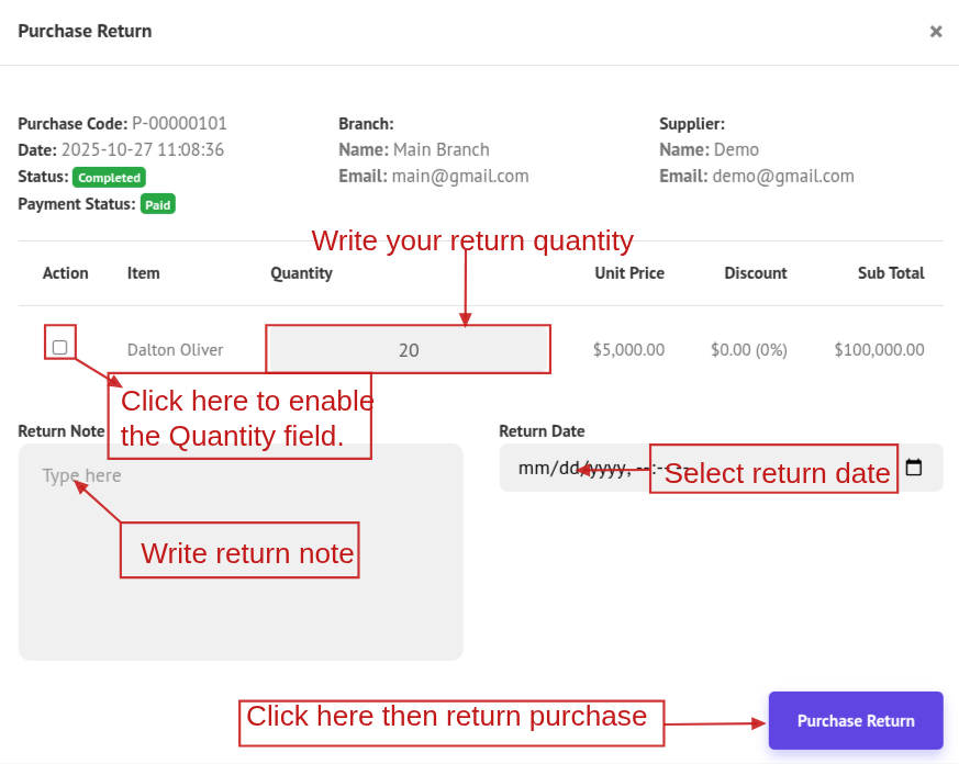 To return a purchased item, click the Return button. A popup will open with the return page. Click the checkbox to enable the quantity field, enter the return quantity, and then click Return Purchase.