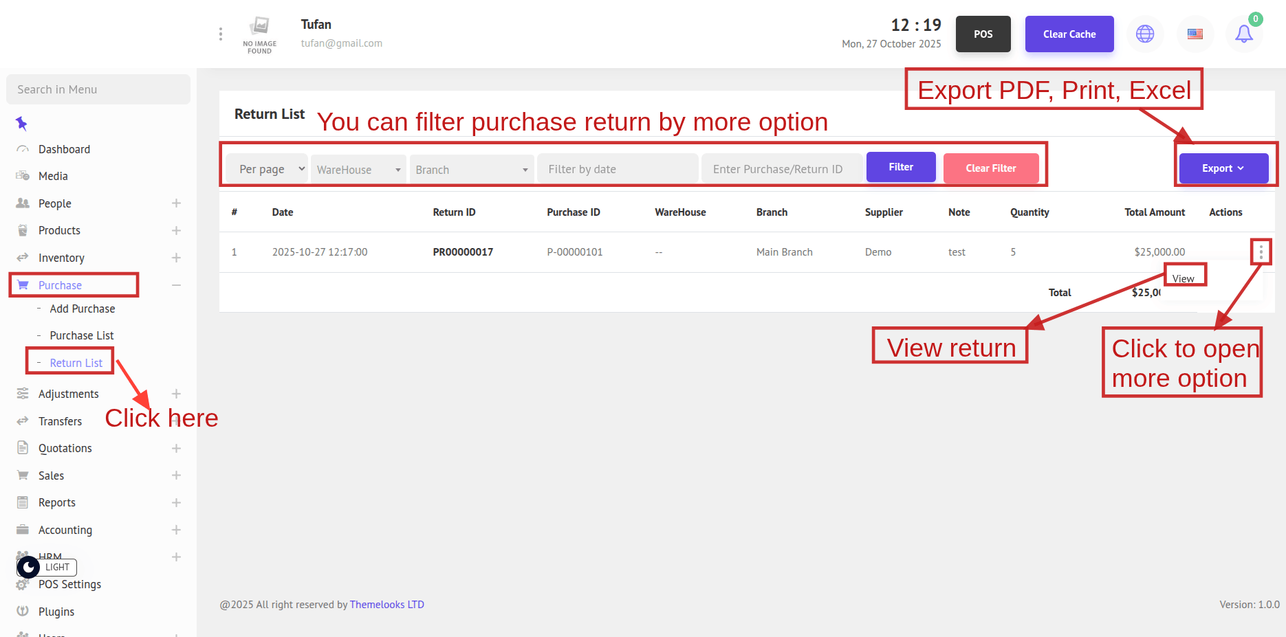 3. To see the Purchase Return List, go to Purchase -> Return List from the menu bar. You will be able to view all returns on the Return List page. You can also export the data by clicking Export, which allows you to download the file in PDF, Print, or Excel format.
