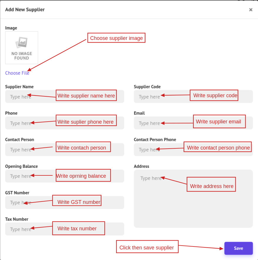 To add a new supplier, click Add New Supplier at the top-right side of the page. A popup modal will appear where you can enter the supplier information. After filling in the details, click the Save button.