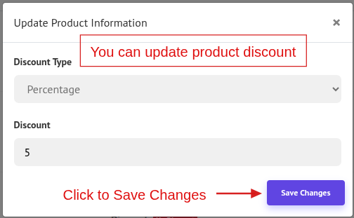If you click Set Discount, a modal will appear where you can update the product discount and save the changes.