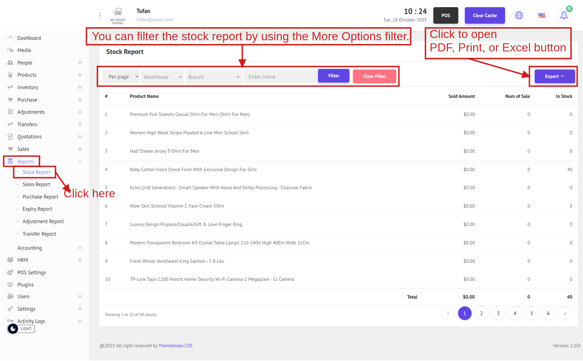 1. To view the Stock Report, go to Reports -> Stock Report from the menu bar. You will be redirected to the Stock Report page, where all stock data is displayed.