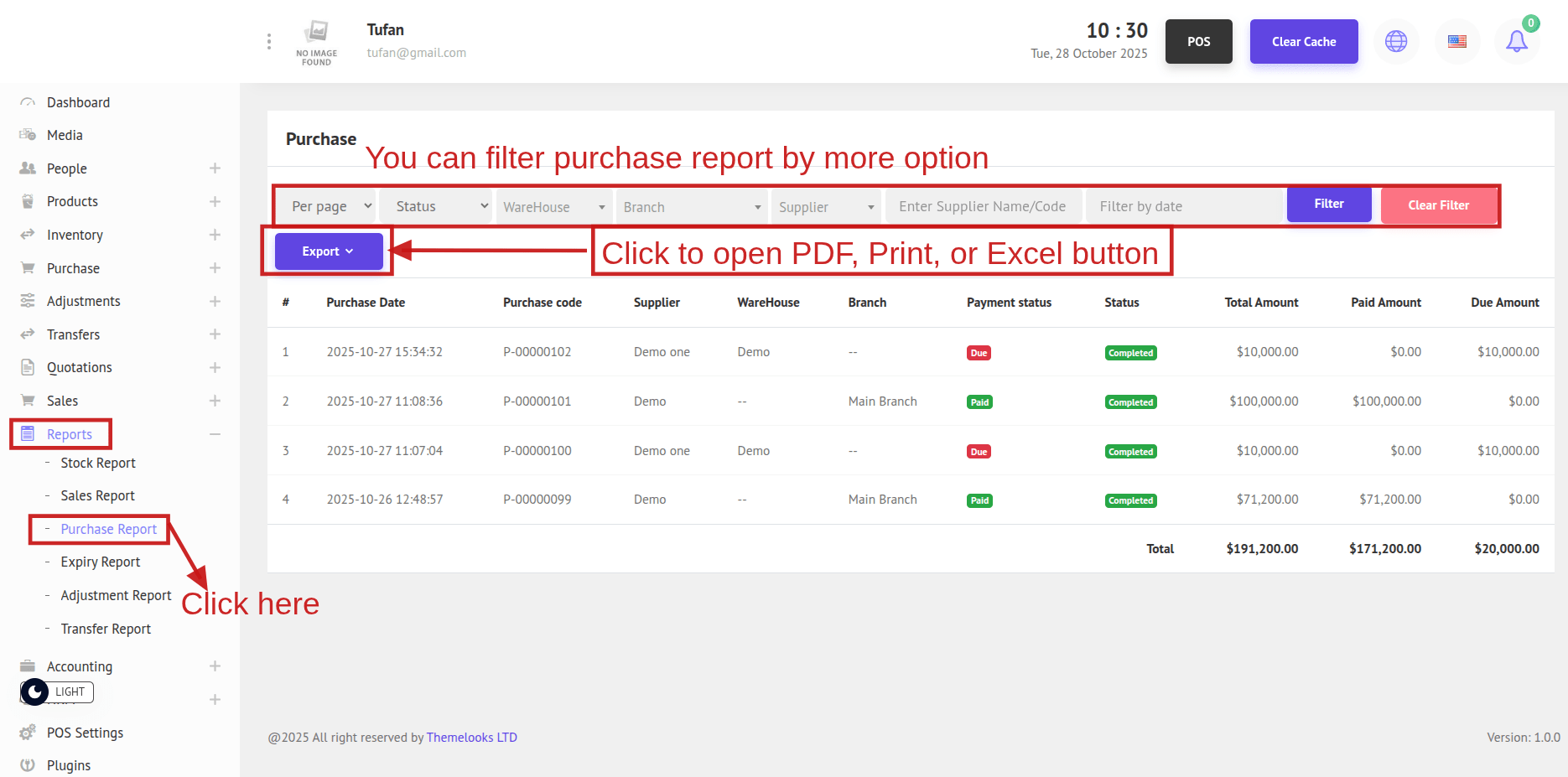 3. Navigate to Reports -> Purchase Report to view all purchase data. Use Export to choose Print, PDF, or Excel and download the report.