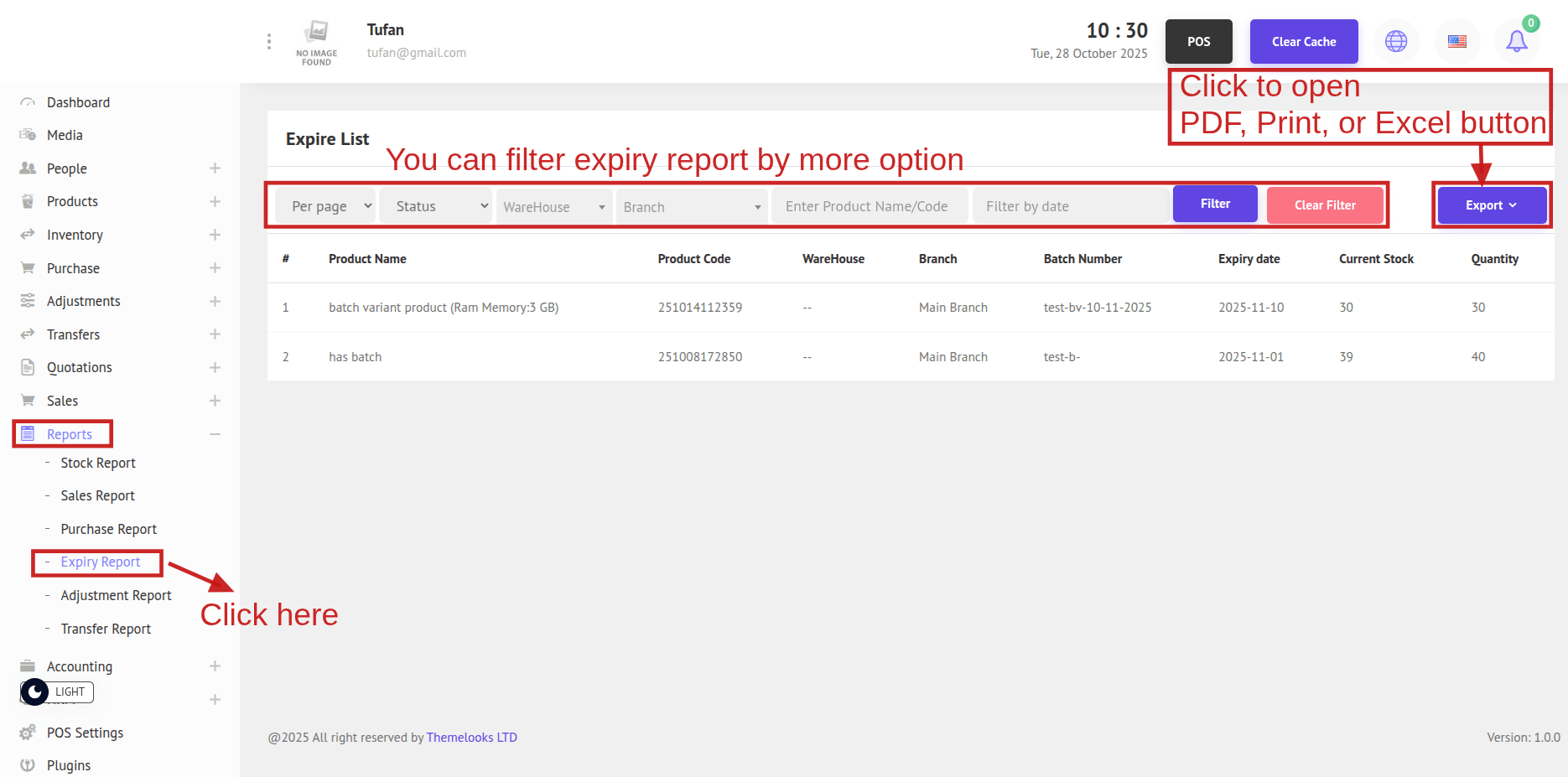 4. Navigate to Reports -> Expiry Report from the menu bar. You’ll be redirected to the Expiry Report page, where all expiry data is displayed. Click the Export button to open a drop-down with Print, PDF, and Excel options, then select your preferred format to download the report.