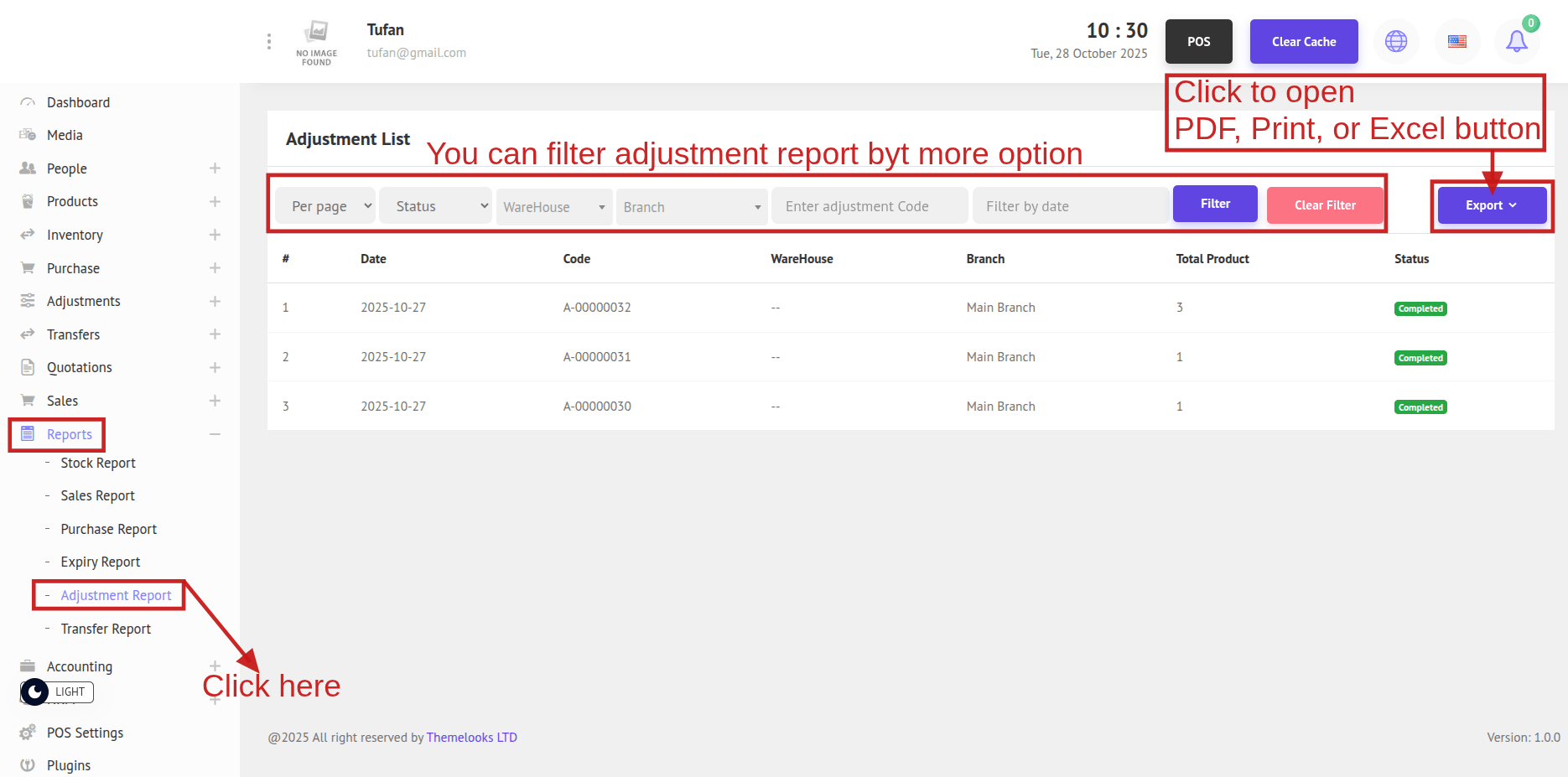 5. To view the Adjustment Report, go to Reports > Adjustment Report from the menu bar. You’ll be redirected to the Adjustment Report page, where all adjustment data is displayed. Click the Export button to open a drop-down with Print, PDF, and Excel options, then select your preferred format to download the report.