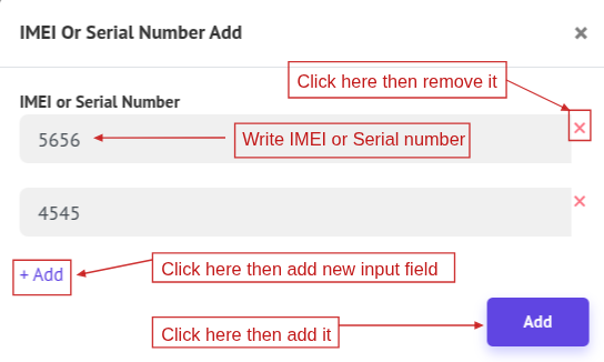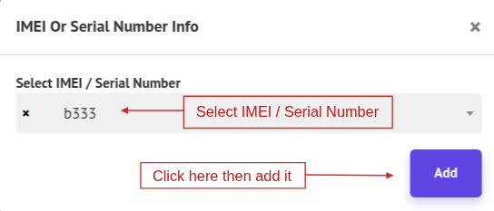 If the product has an IMEI or Serial Number and the adjustment type is Addition, a popup modal will appear. Add the IMEI number and click Add. You can also edit the IMEI by clicking the Edit icon, or view it by clicking the View icon to open a popup modal showing the IMEI or Serial Number details.