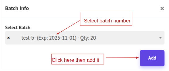 If your product has a Batch, a popup modal will appear where you can select the batch and click Add to include it. You can also edit the batch by clicking the Edit icon, changing the selection, and then clicking Add again to save the changes.