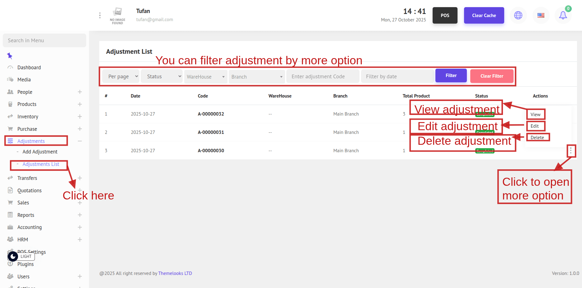 2. To see the Adjustment List, go to Adjustment -> Adjustment List from the menu bar. You will be able to view all adjustments on the Adjustment List page.