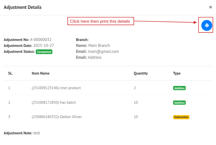 You can also view the details of an adjustment by clicking the View button. A popup modal will appear showing the adjustment details. You can print this page by clicking the Print icon, which will open the print view.