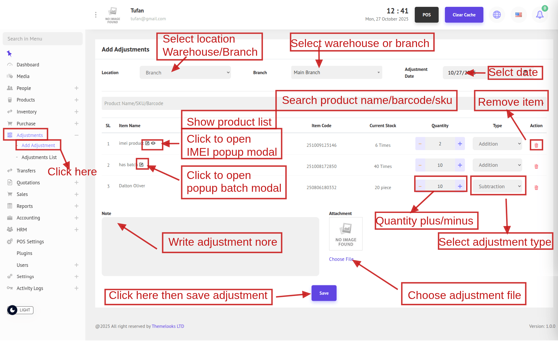 1. To add a new adjustment, navigate to Adjustment -> Add Adjustment from the menu bar. This will redirect you to the Add Adjustment page where you can create a new adjustment record.