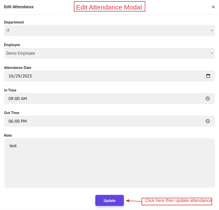 To update an attendance record, click Edit, make the necessary changes in the popup, then click Update.