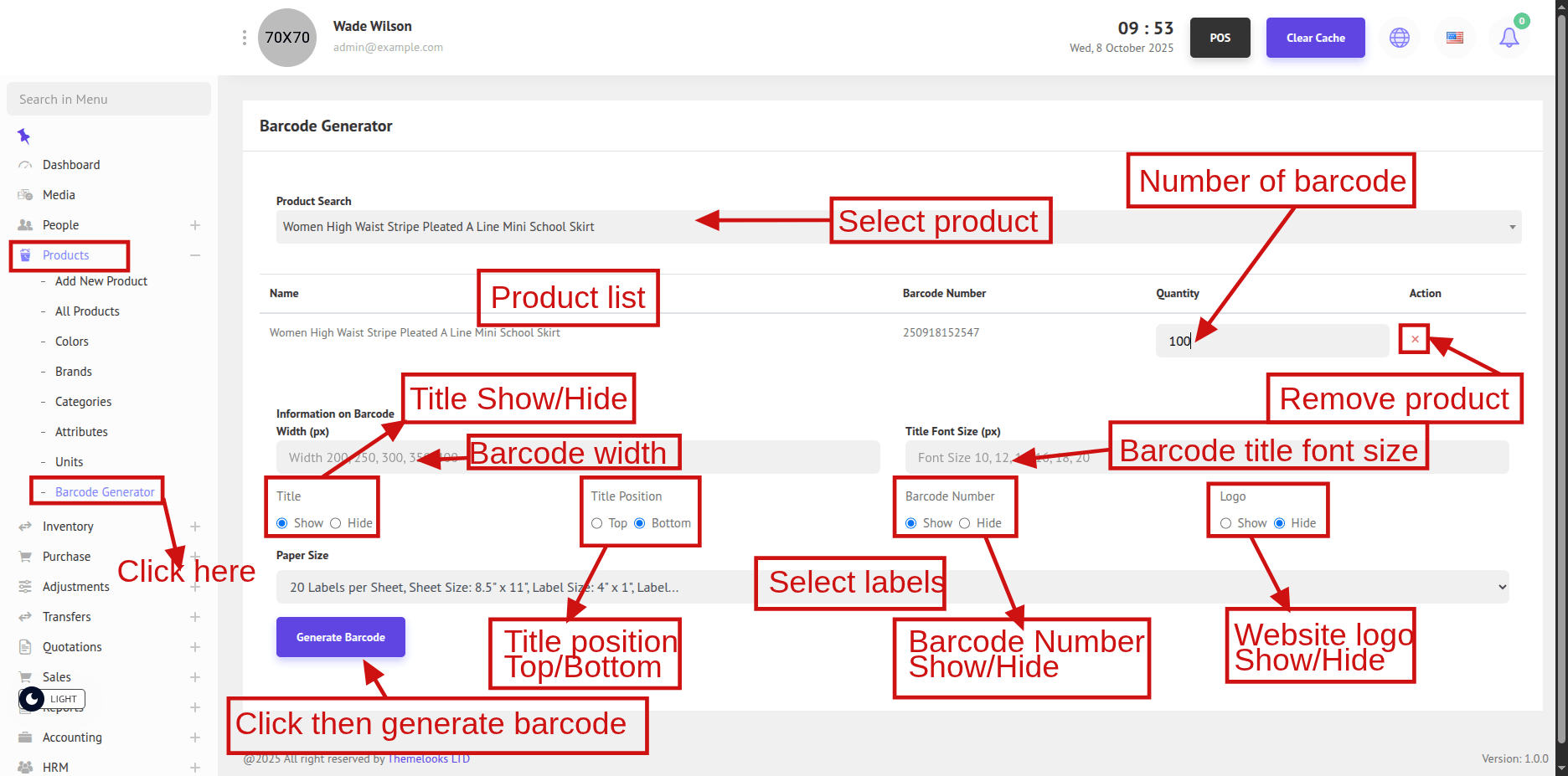 To view the Barcode Generator, navigate to Products > Barcode Generator. Here, you will see the Bar-code Generator page where you can generate bar-codes for your products.
