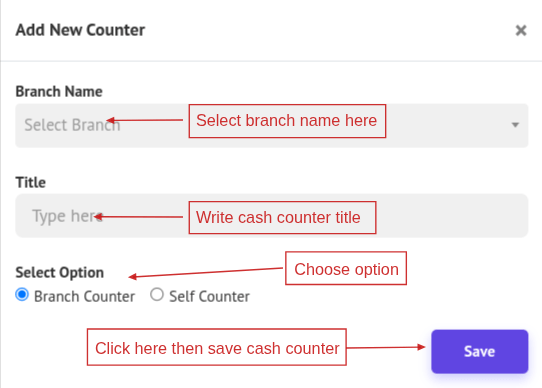 To create a new cash counter, click Add New Counter. A popup window will open—complete the required fields and click Save to create the cash counter.
