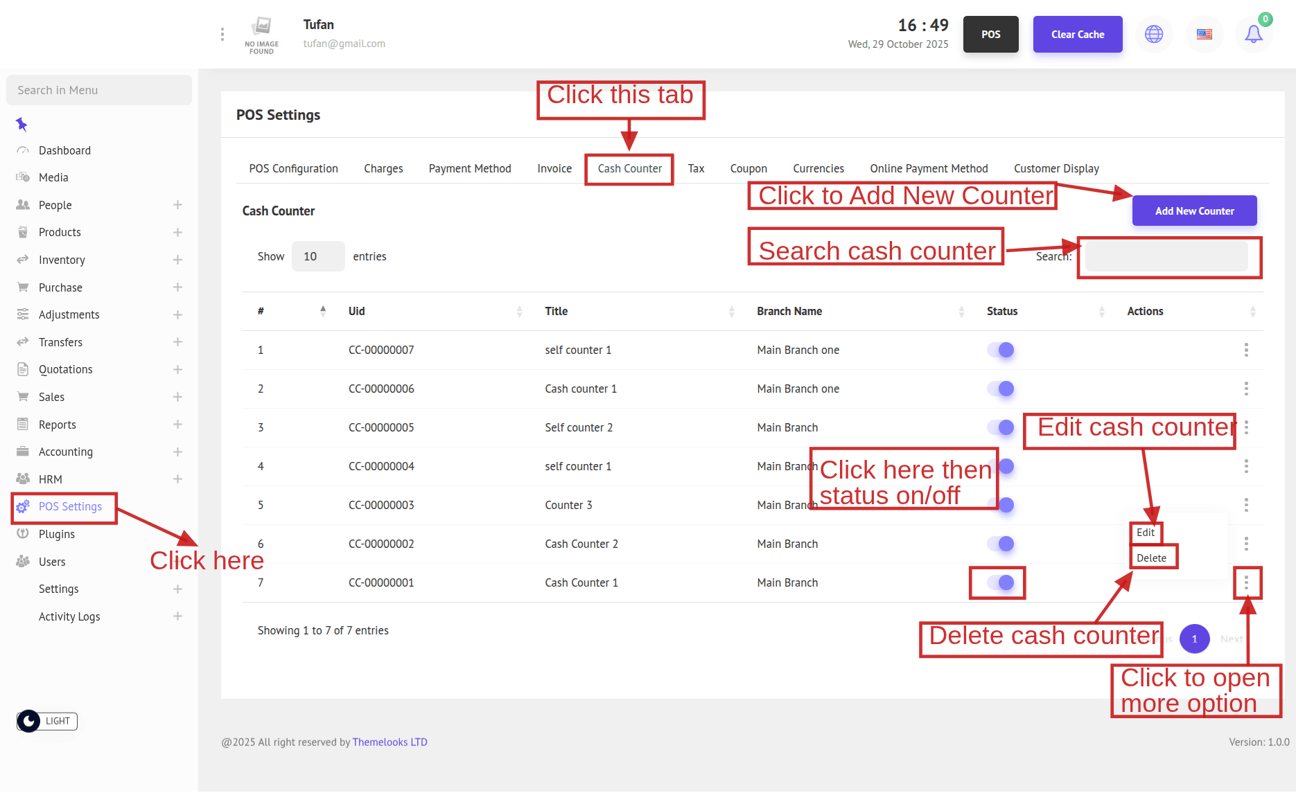 Navigate to POS Settings, When the POS Settings page loads, click the Cash Counter tab from the tab bar. The system will open the Cash Counter page, showing all cash counter entries.
