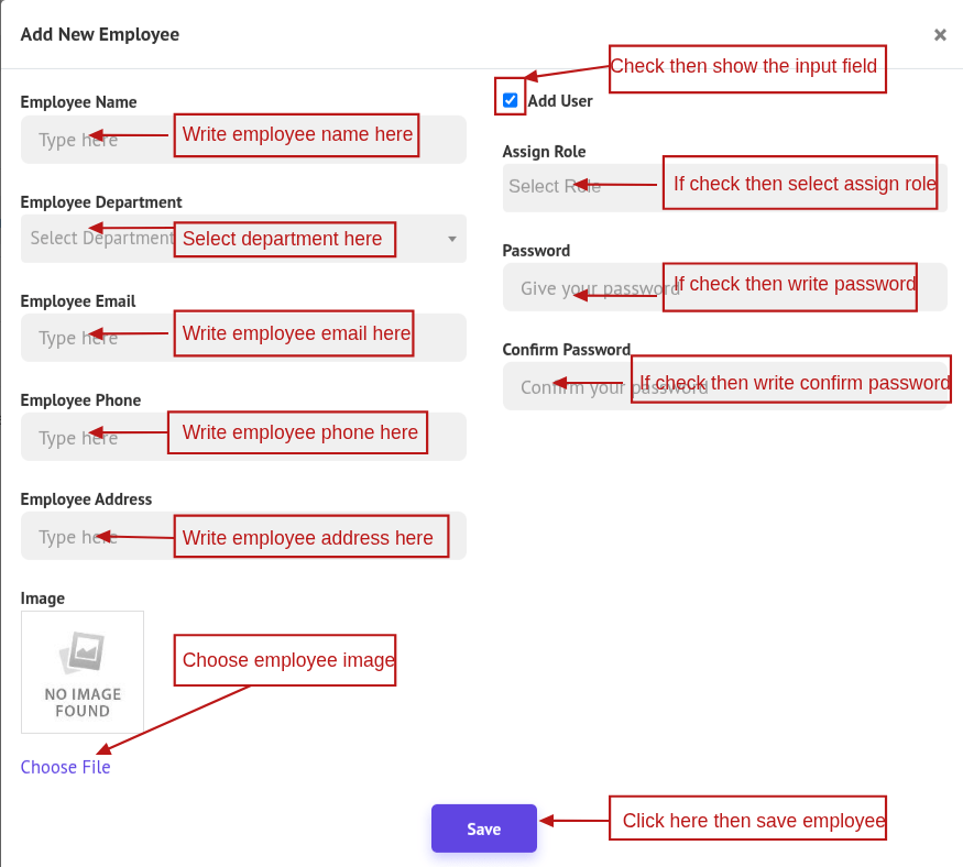 In the modal, there’s an Add User checkbox. Check this to create a login user for the employee; leave it unchecked if a user account isn’t needed.