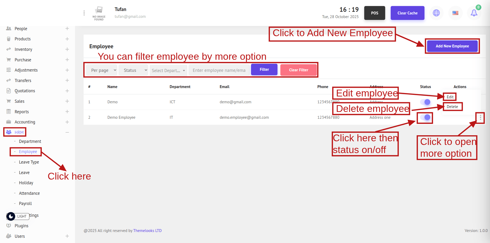 To see the Employee, go to HRM -> Employee from the menu bar. You will be able to view all employee on the Employee page.