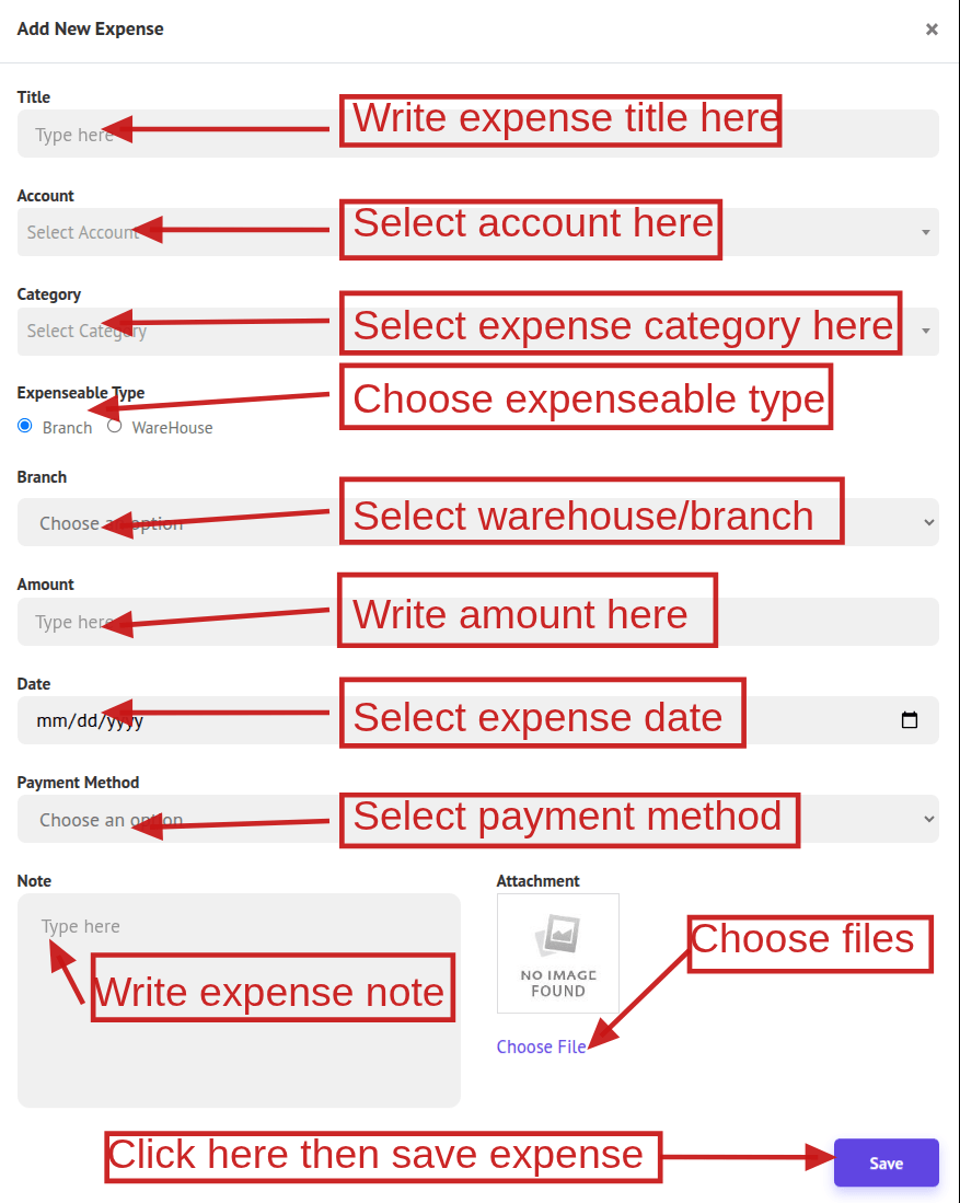 Before creating an expense, set up an Expense Category and an Account. Then click Add New Expense. When the form opens, choose the Expenseable Type (Warehouse or Branch). Based on your selection, the corresponding Warehouse or Branch drop-down will appear. Complete the remaining fields and click Save to create the expense.