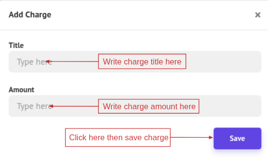 To create a new charge, click Add charge. A popup window will open—complete the required fields and click Save to create the charge.