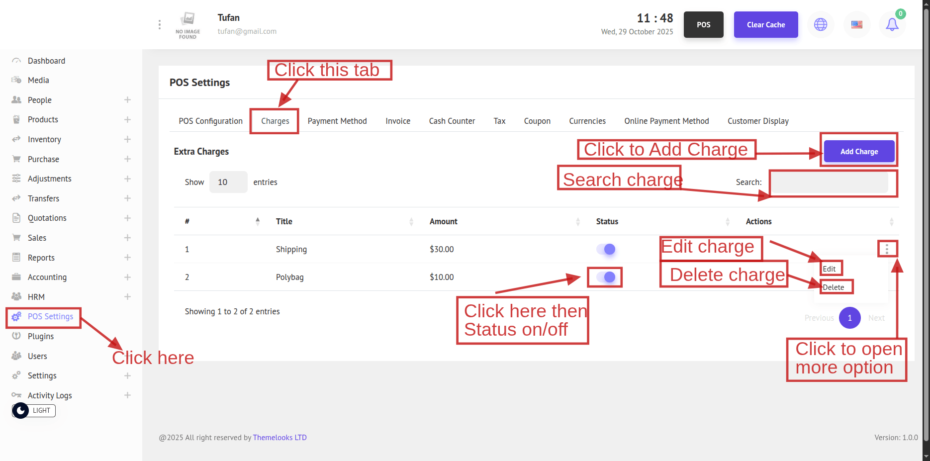 Go to POS Settings, then open the Charges tab to view the list of charges.